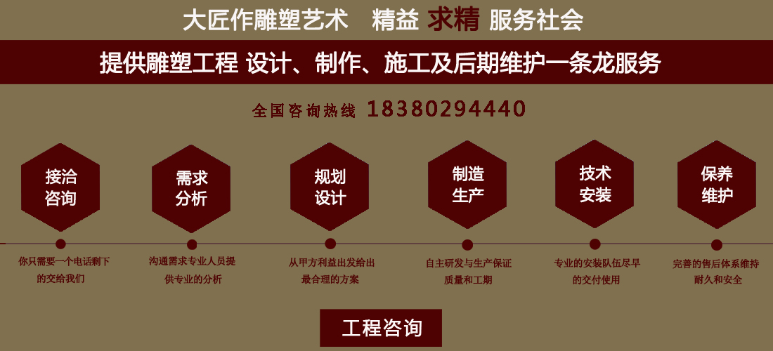 成都大匠作雕塑有限公司,是經(jīng)成都工商局審定注冊的正規(guī)專業(yè)雕塑制作及工程安裝服務機構,是由一群年輕富有朝氣的年輕人創(chuàng)辦,發(fā)軔于四川省成都市龍泉驛區(qū)。它是一家******于創(chuàng)作、制作和銷售為一體的公司。大匠作擁有多年從事公共藝術的專業(yè)人員和雕塑制作人組成的核心團隊,為您提供專業(yè)、具創(chuàng)新的設計及制作服務。公司成立以來,秉承“******服務、誠信為本”的宗旨,以客戶需求為目標導向,不斷學習,進取,優(yōu)化和提高服務質量,公司向您******——“您的滿意***是我們的信譽”,我們將以飽滿的熱情和******的服務贏得您的贊譽和支持。
